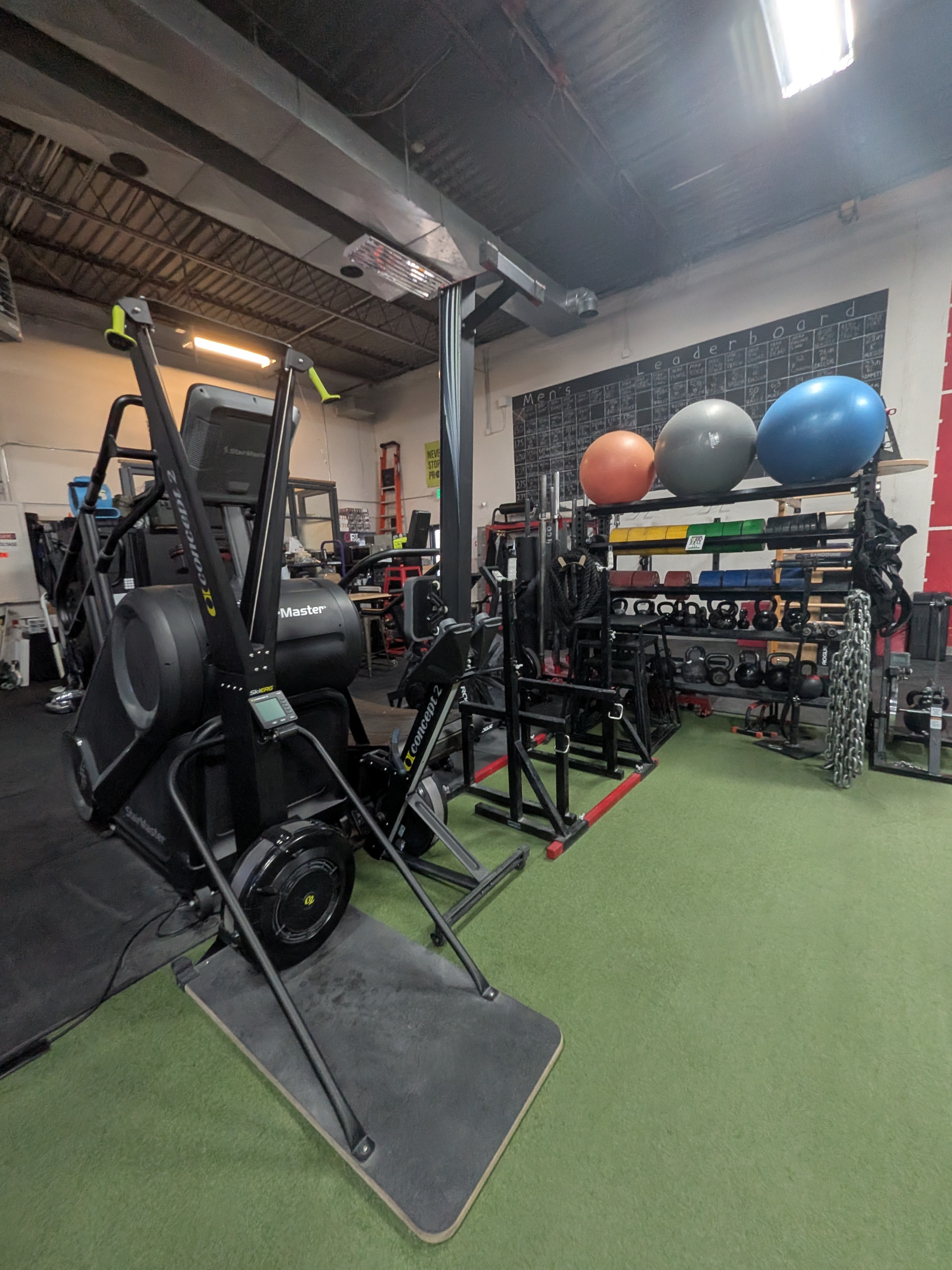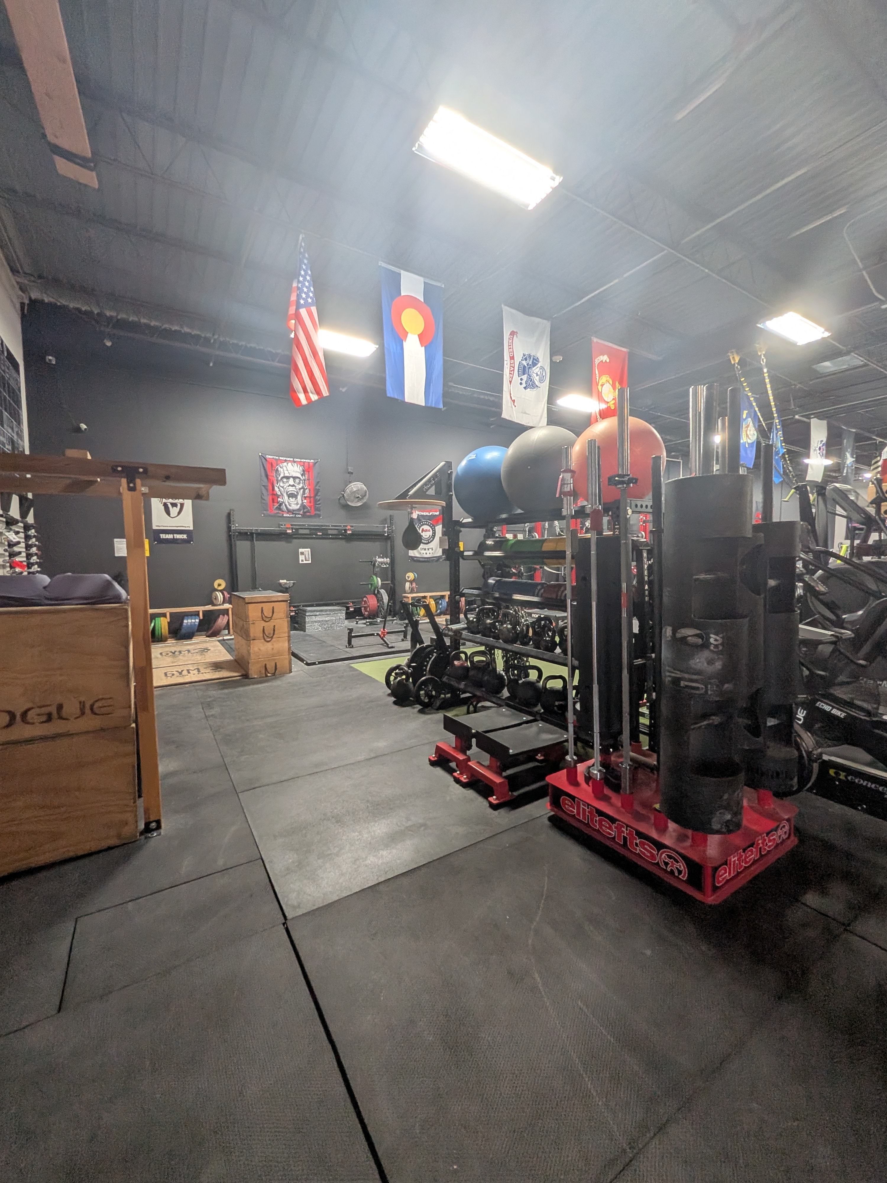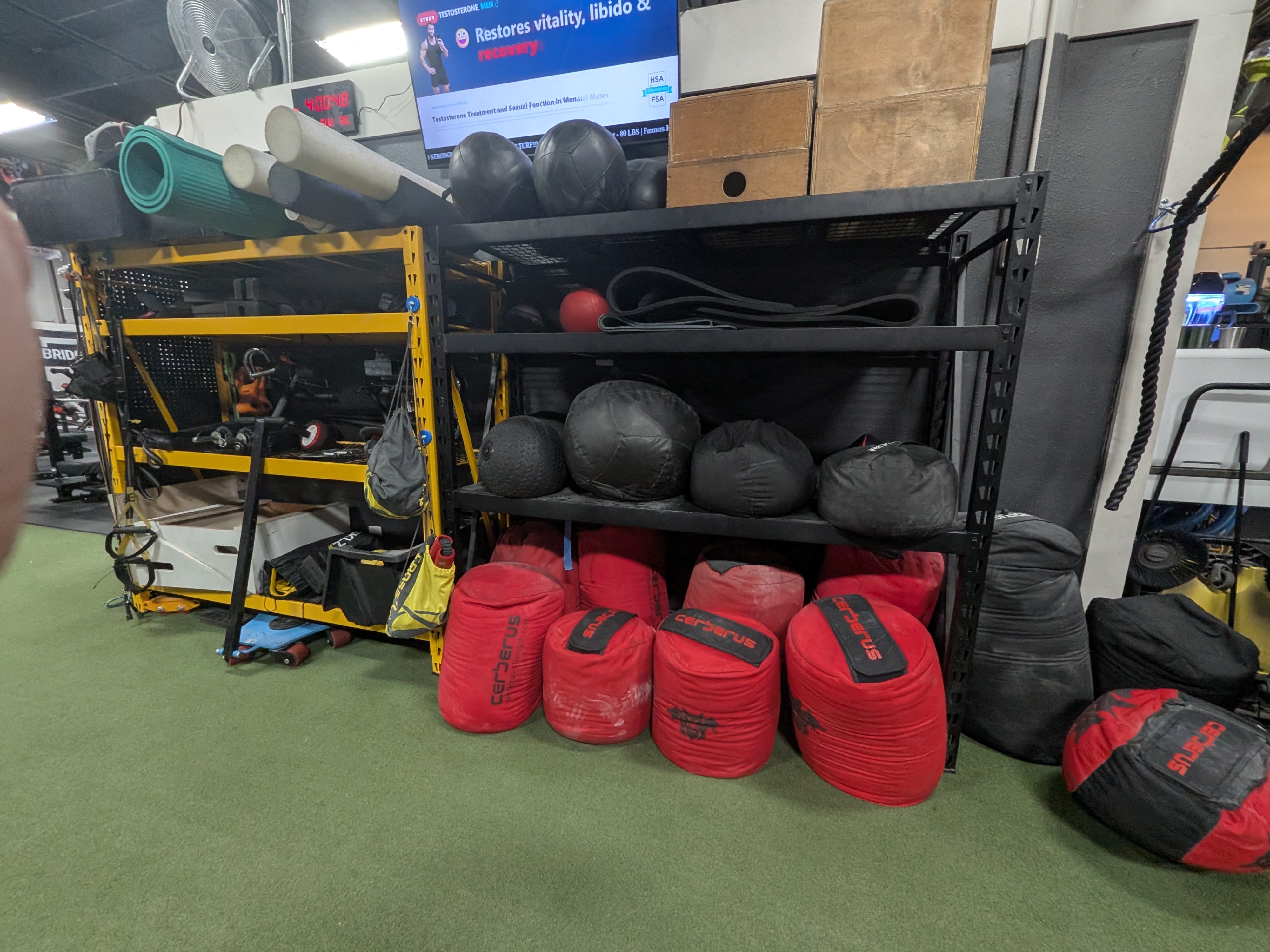 Atlas stones 35 to 440. Competition yokes. Farmers and frame carries. Logs, axles, and circus dumbbells. Dinnie handles. Viking press. Indoor 17 foot bag toss lane. Modular medley flooring. Crash pads, sleds, tires, sandbags, and full turf.