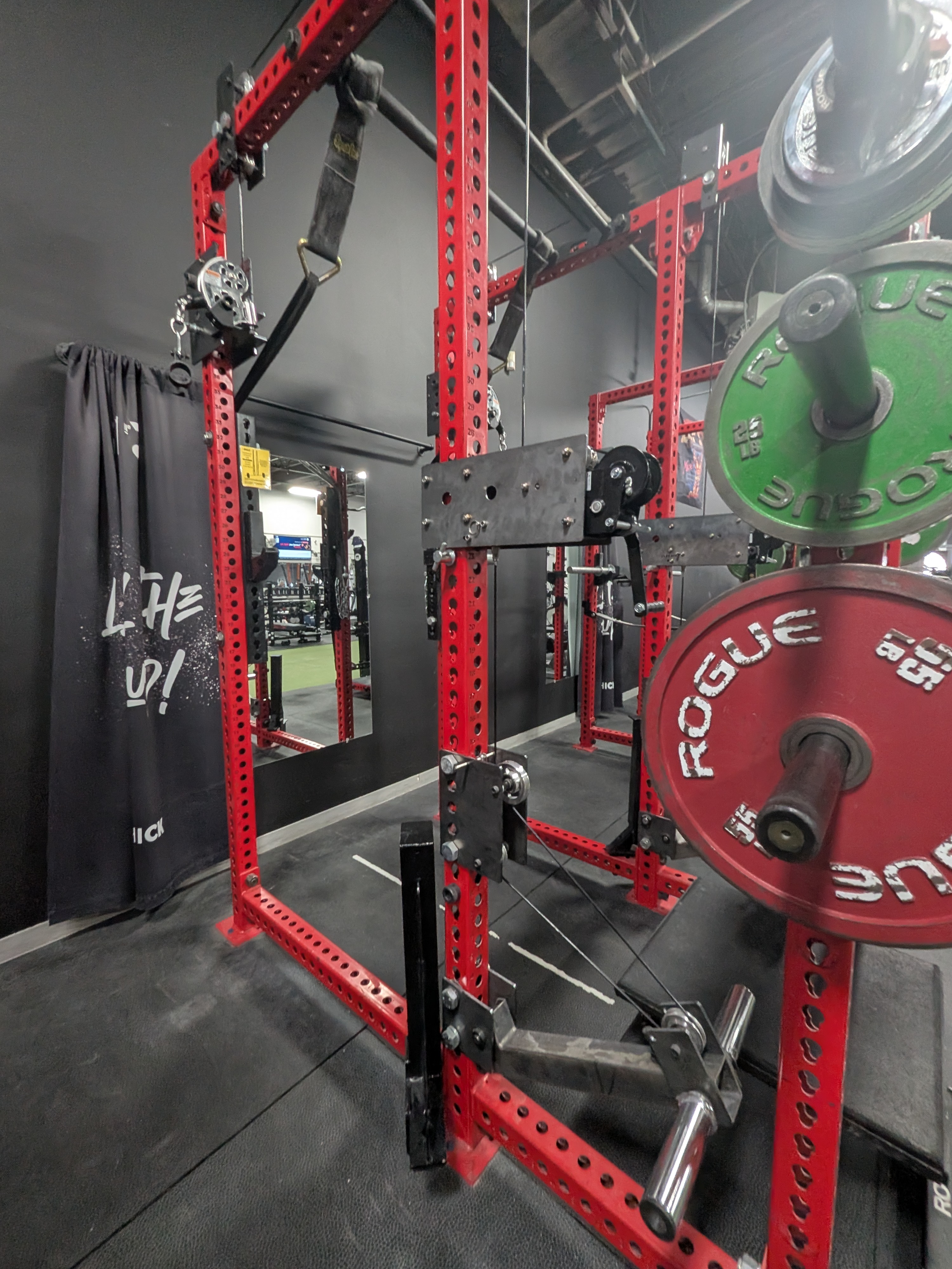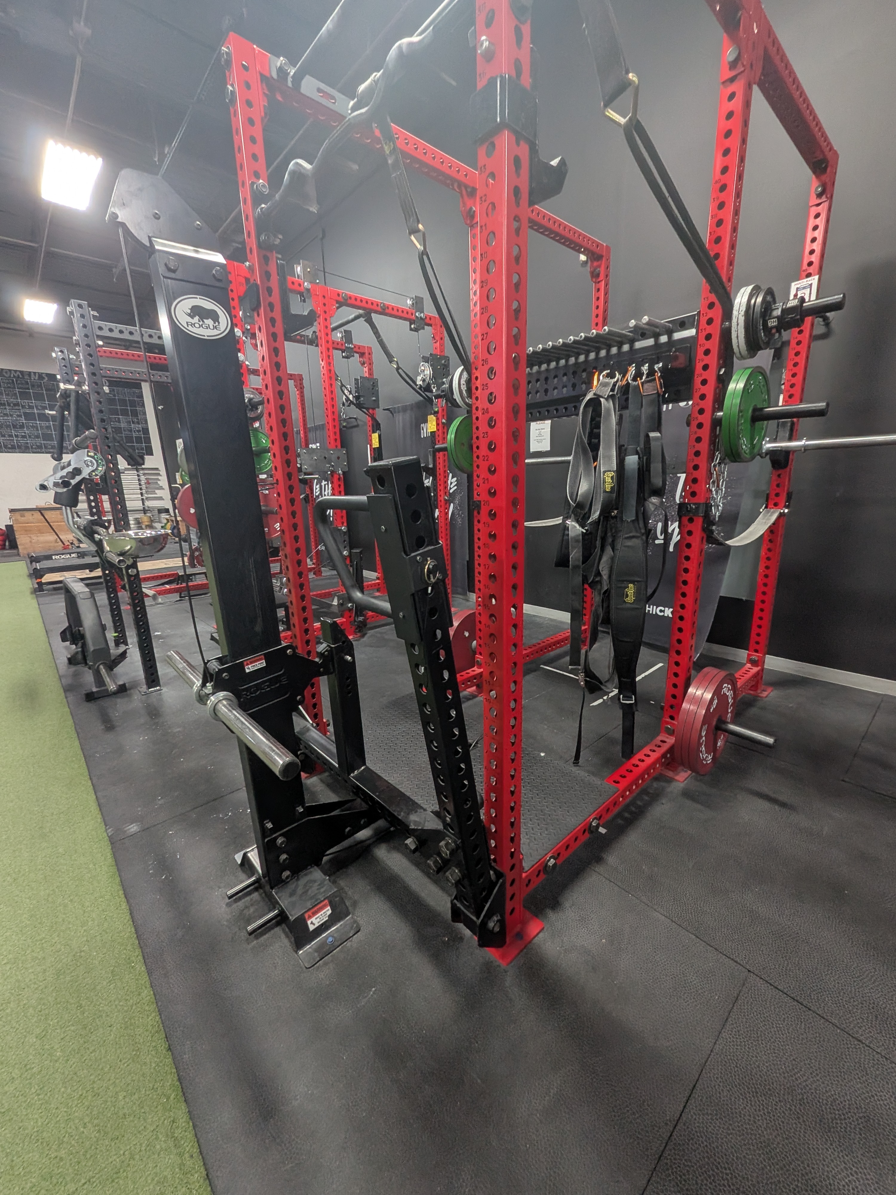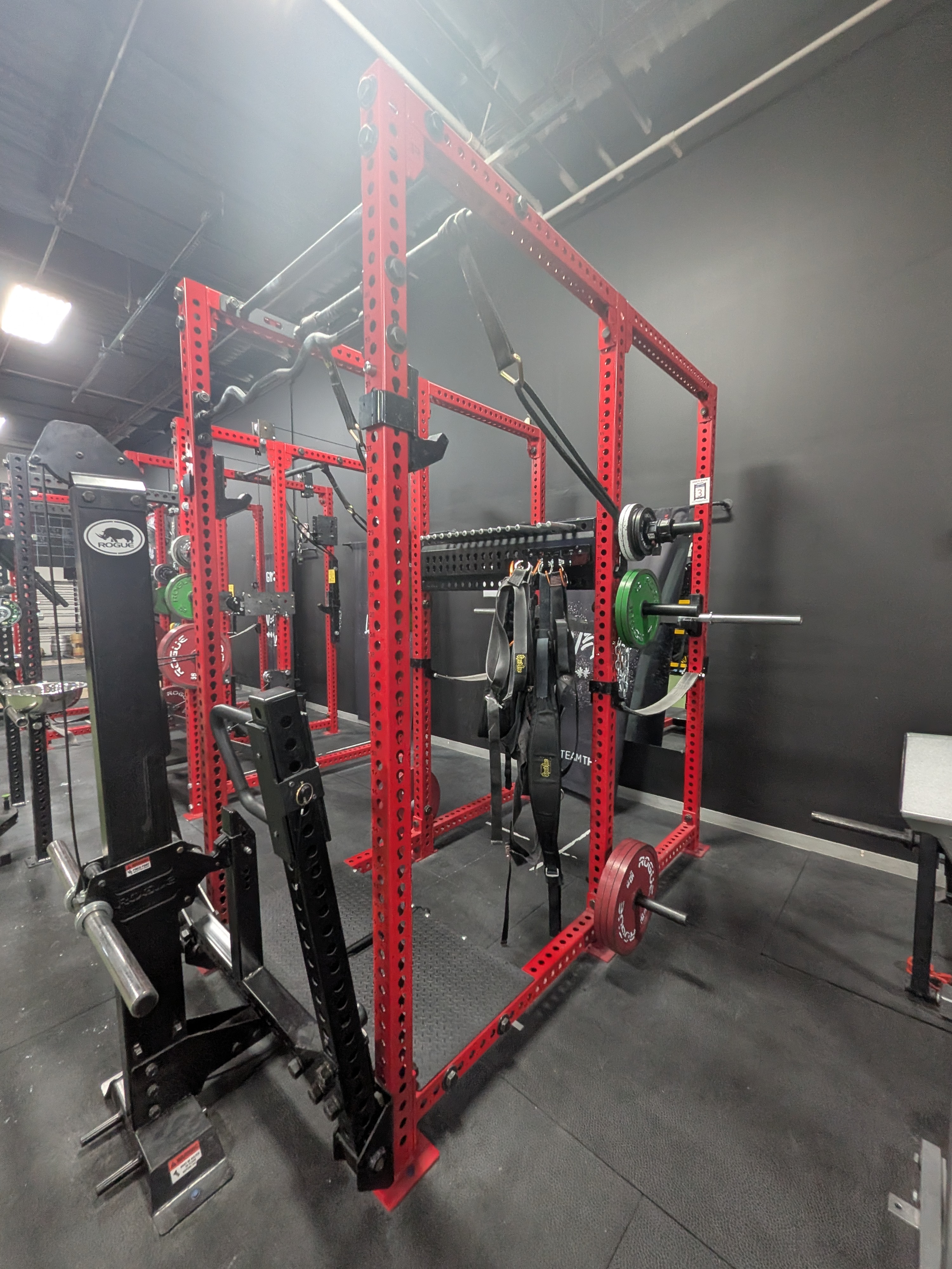 Competition and combo racks. Monolifts. Calibrated plates. Power bars. Accessory density.