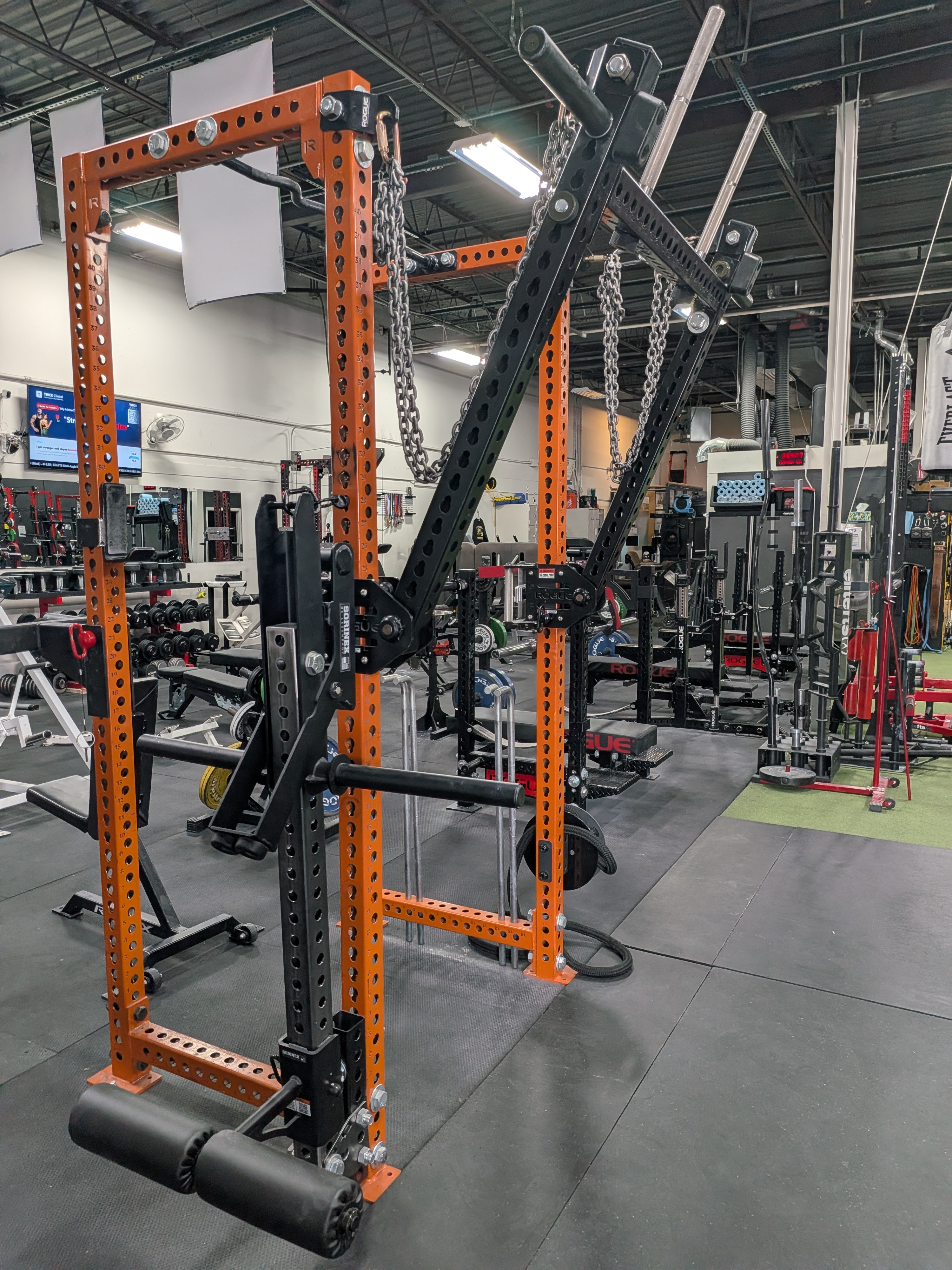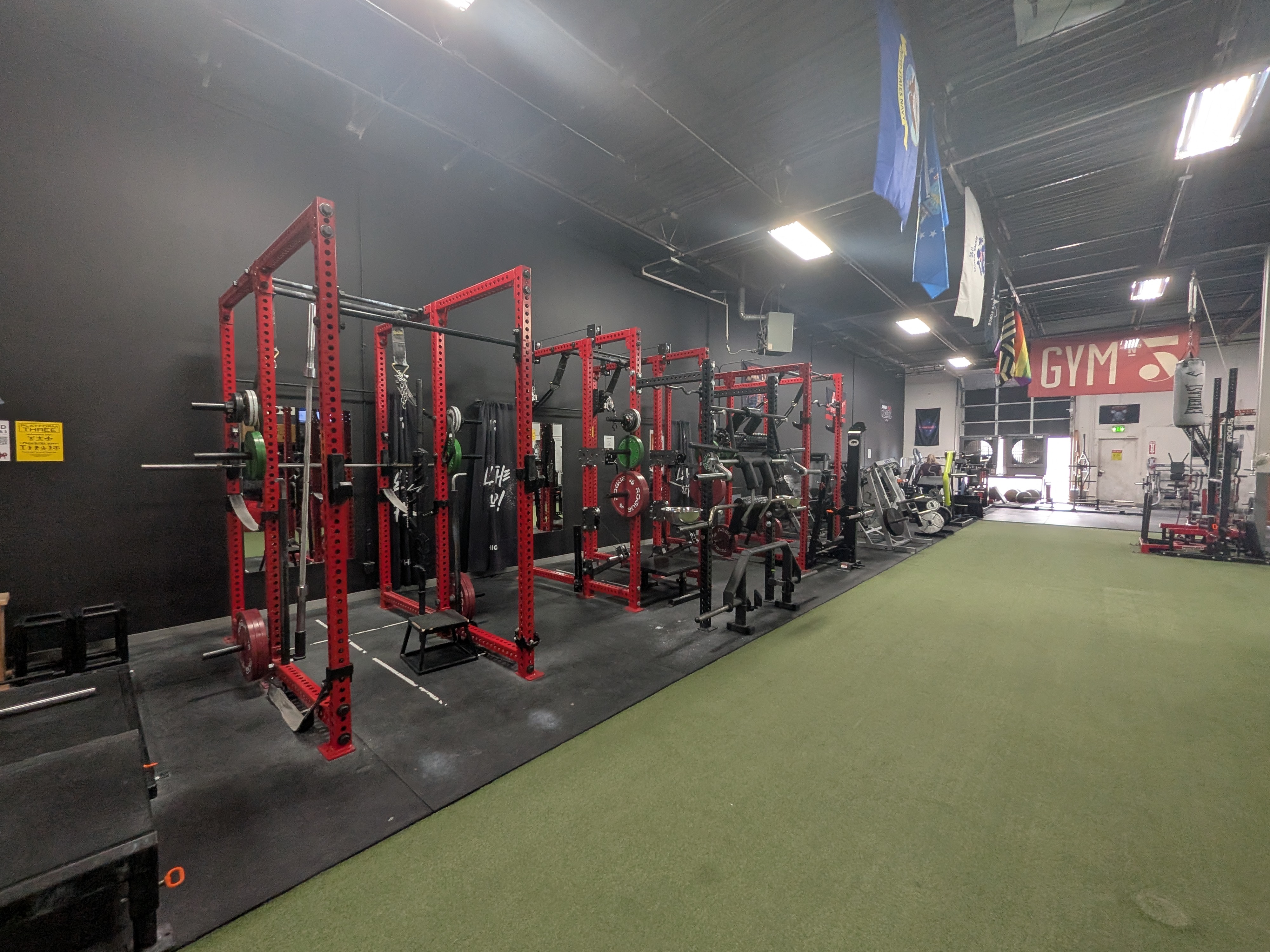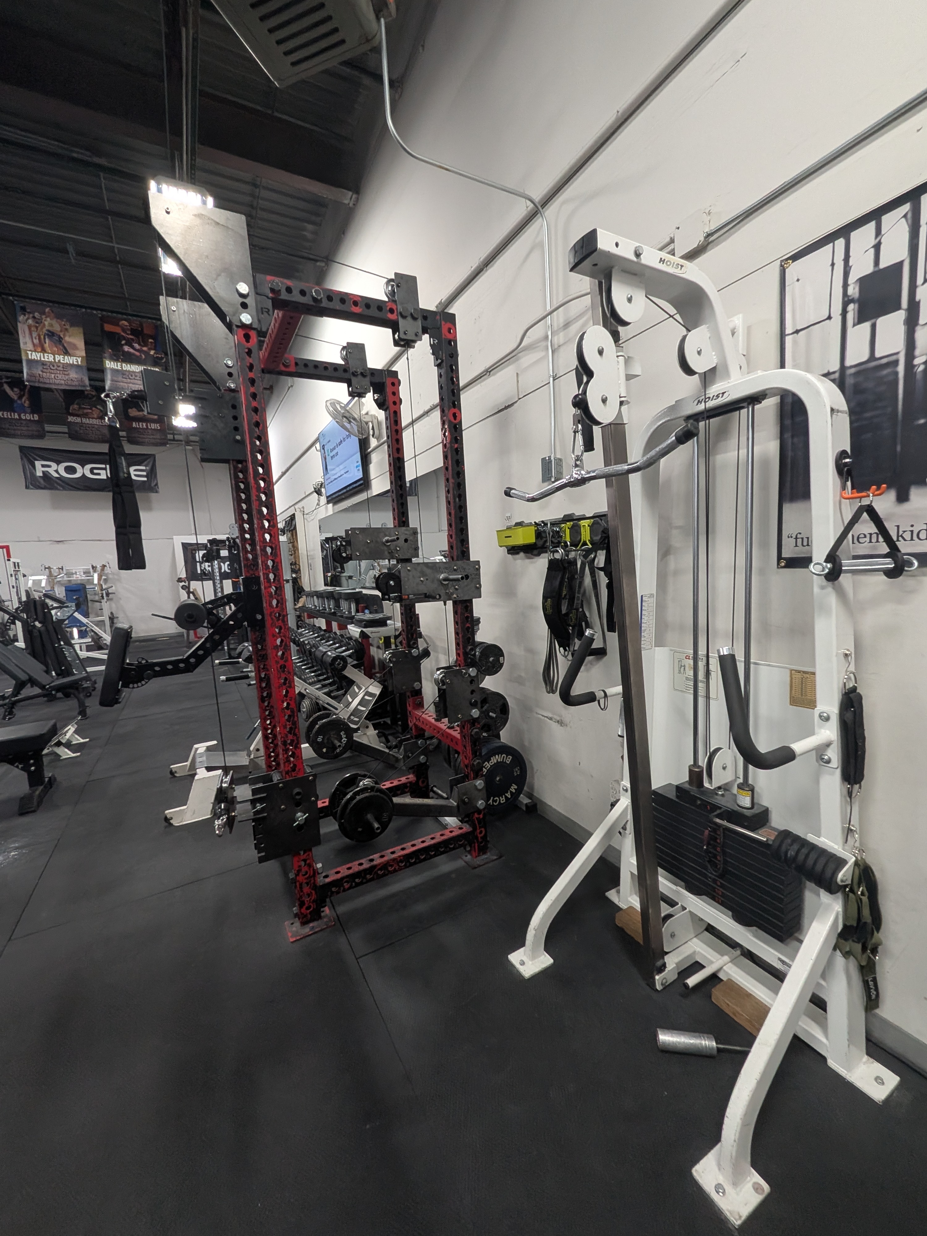 Competition and combo racks. Monolifts. Calibrated plates. Power bars. Accessory density.